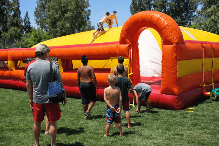 - OCCUPANCY: A maximum of 5-6 kids of equal size at one time for bounce houses, and 1 person at a time for slides is what most inflatable manufacturers recommend.