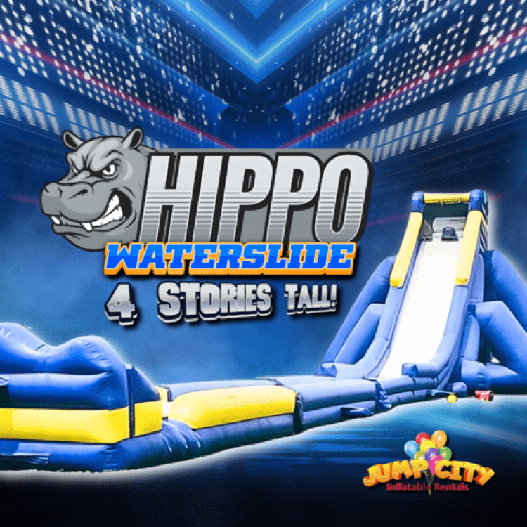 Make a big splash with the Hippo Water Slide, a towering inflatable water attraction that rises 4 stories tall and brings serious excitement to any event. With its bold hippo-themed design and eye-catching blue-and-yellow colors, this slide is built to stand out and keep guests talking. Riders climb to the top and race down the steep slide for a fast, thrilling ride that is perfect for hot-weather fun, birthday parties, school events, festivals, backyard celebrations, and other large gatherings. This impressive rental delivers high-energy entertainment and a memorable centerpiece that adds plenty of action to your outdoor party.